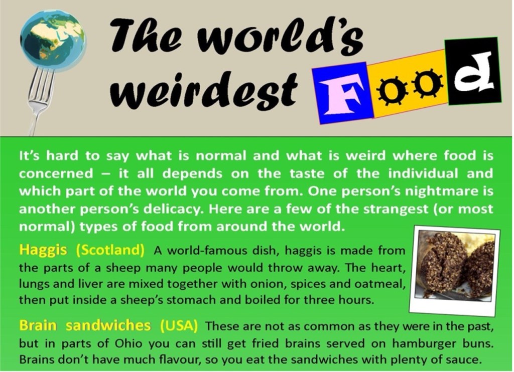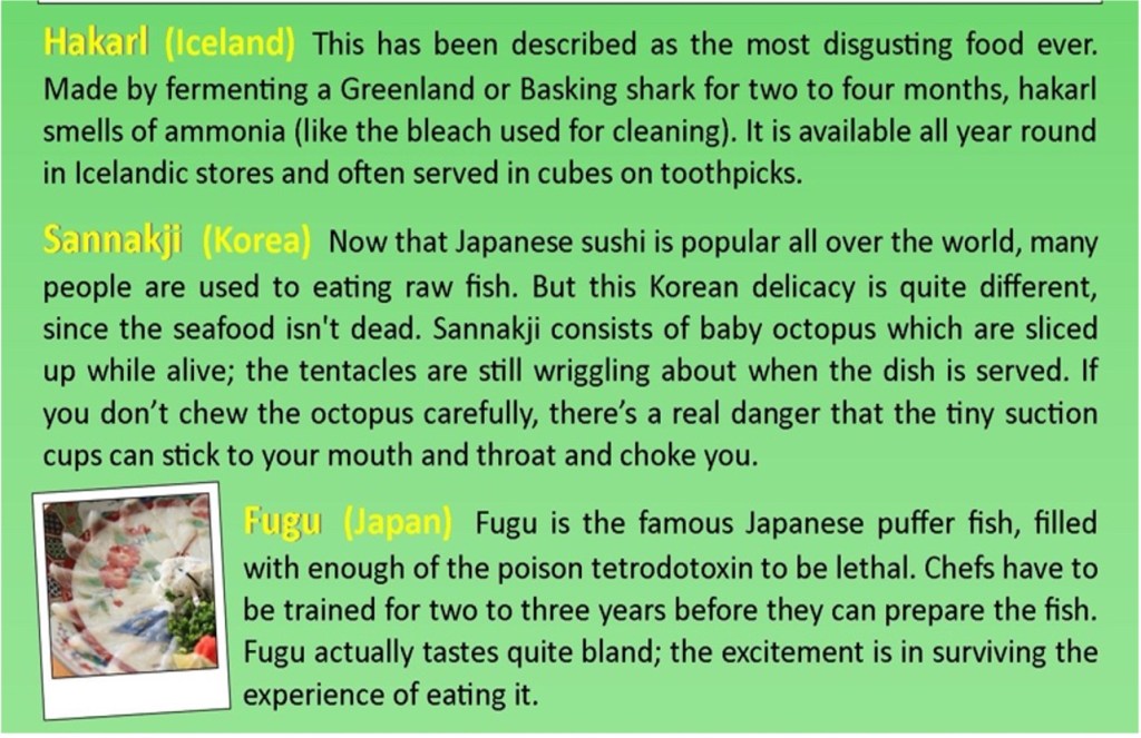 Exc. 10 Adapted from https://learnenglishteens.britishcouncil.org/skills/reading/b2-reading/worlds-weirdest-food