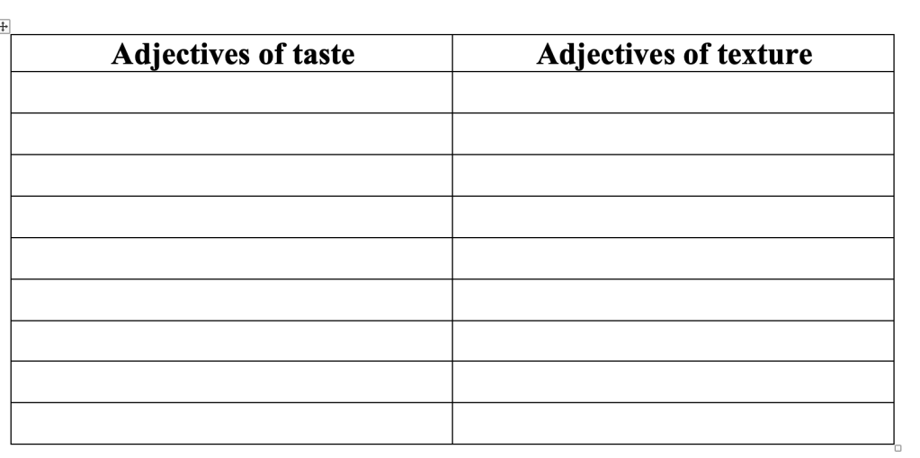 Work in pairs. Here are the words from the Quizlet. Divide them up into words describing taste and words describing texture..