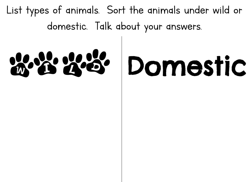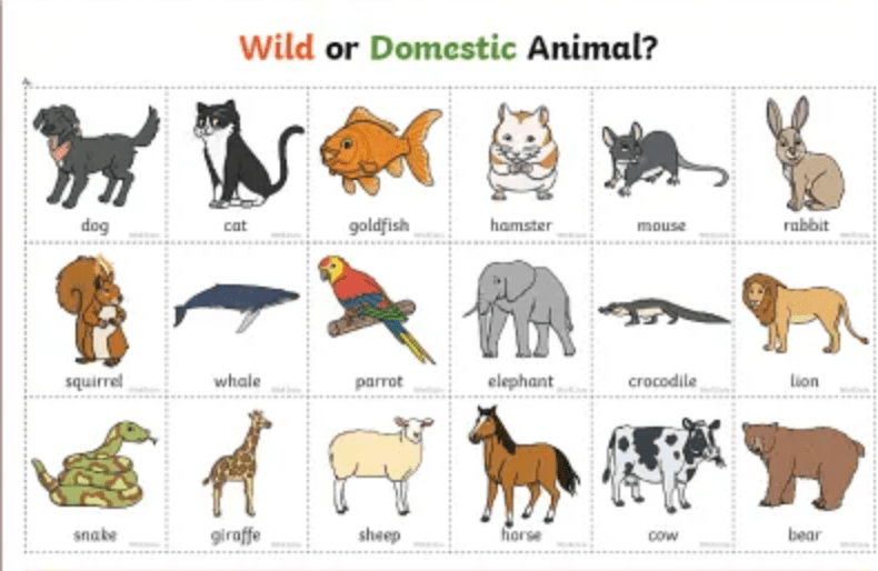 Draw a table with two columns like the one below. Make a list of as many wild and domestic animals you can think of. Put their names in the right columns.